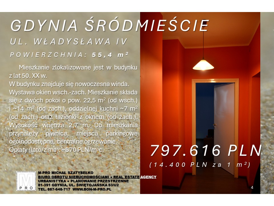 Mieszkanie zlokalizowane jest w budynku z lat 50. XX w. W budynku znajduje się nowoczesna winda. Wystawa okien wsch.-zach. Mieszkanie składa się z dwóch pokoi o pow. 22,5 m2 (od wsch.) i ~14 m2 (od zach.), oddzielnej kuchni ~7 m2 (od zach.) oraz łazienki z oknem (od zach.). Wysokość wnętrza 2,7 m. Do mieszkania przynależy piwnica, miejsca parkingowe ogólnodostępne, centralne ogrzewanie.
